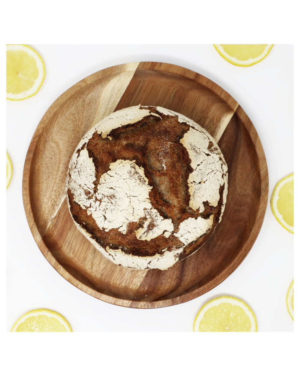 50 % farine de blé, 50% farine de seigle complete, eau, sel de Camargue, levain naturel de seigle et zestes de citron