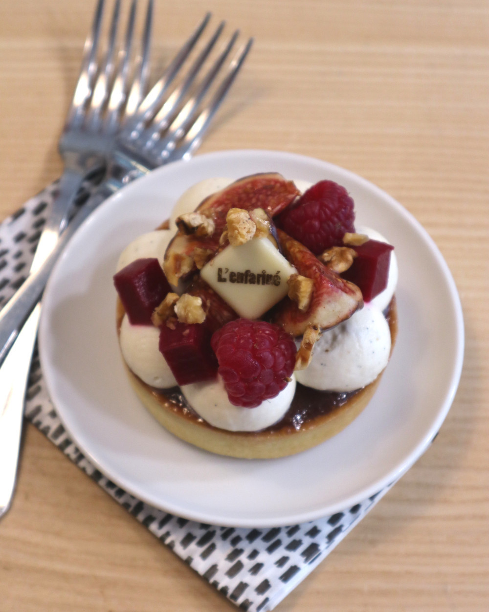 Compotée de figue, moelleux aux noix, chantilly vanille Bourbon et mascarpone, gélée de framboise, figues et de framboises fraîches