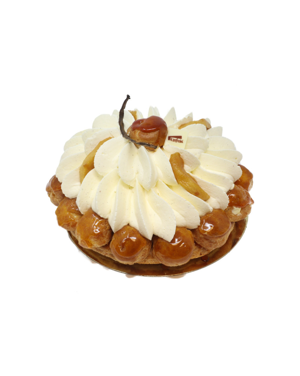 Le Saint-Honoré aux pommes caramélisées est un incontournable dans notre vitrine à l'automne. Cette version revisitée du célèbre dessert français allie la légèreté de la pâte feuilletée et des choux croquants avec la douceur de la crème diplomate à la vanille, sublimée par des pommes caramélisées fondantes qui apportent une touche sucrée et acidulée.