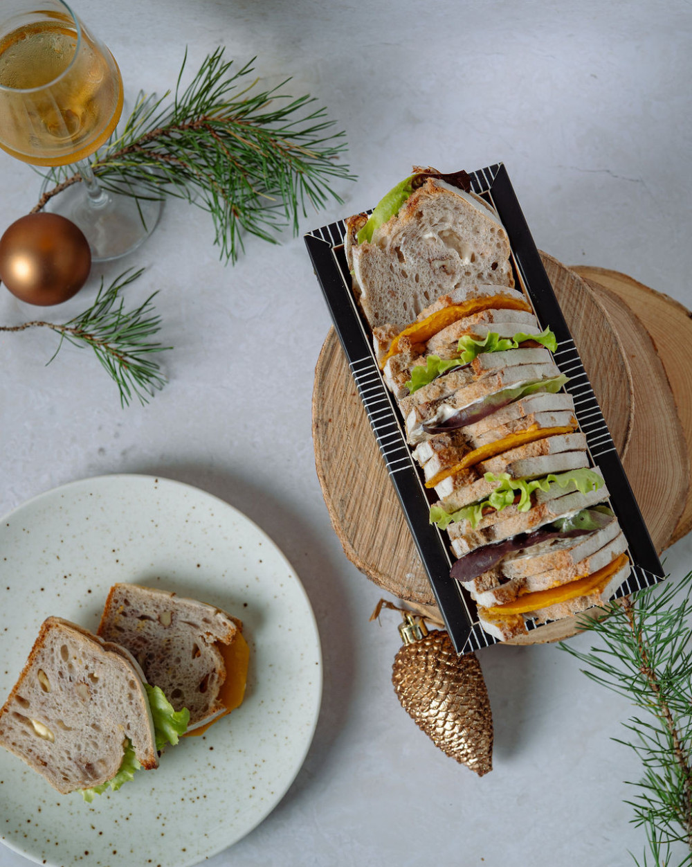 Crème butternut amande, butternut rôtie au thym et miel, crémeux gorgonzola léger et poires cuites au four, terrine de gibier fraîche, le tout enveloppé dans un pain de seigle aux noix.